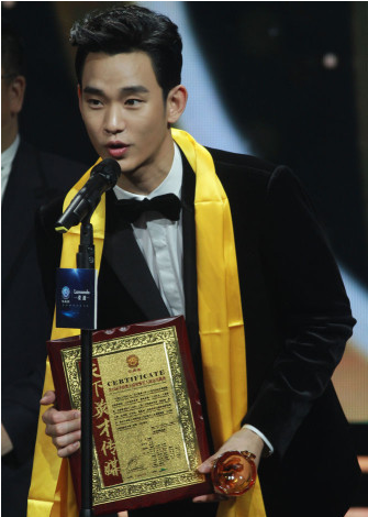 凭借一部《来自星星的你》,金秀贤一跃成为国际超人气偶像,在本届华鼎奖斩获“全球最佳电视剧男演员”大奖。金秀贤在颁奖典礼现场收获了最多粉丝尖叫声,“都教授“魅力不减。当晚金秀贤在台下保持着都敏俊式的表情安静观礼,不时报以礼貌性的鼓掌。在韩国组合super junior登台献唱时,金秀贤跟随歌曲的节奏拍起了手。作为当晚的人气王,金秀贤不时被主持人吴宗宪[微博]调侃称赞,让他露出羞涩浅笑。